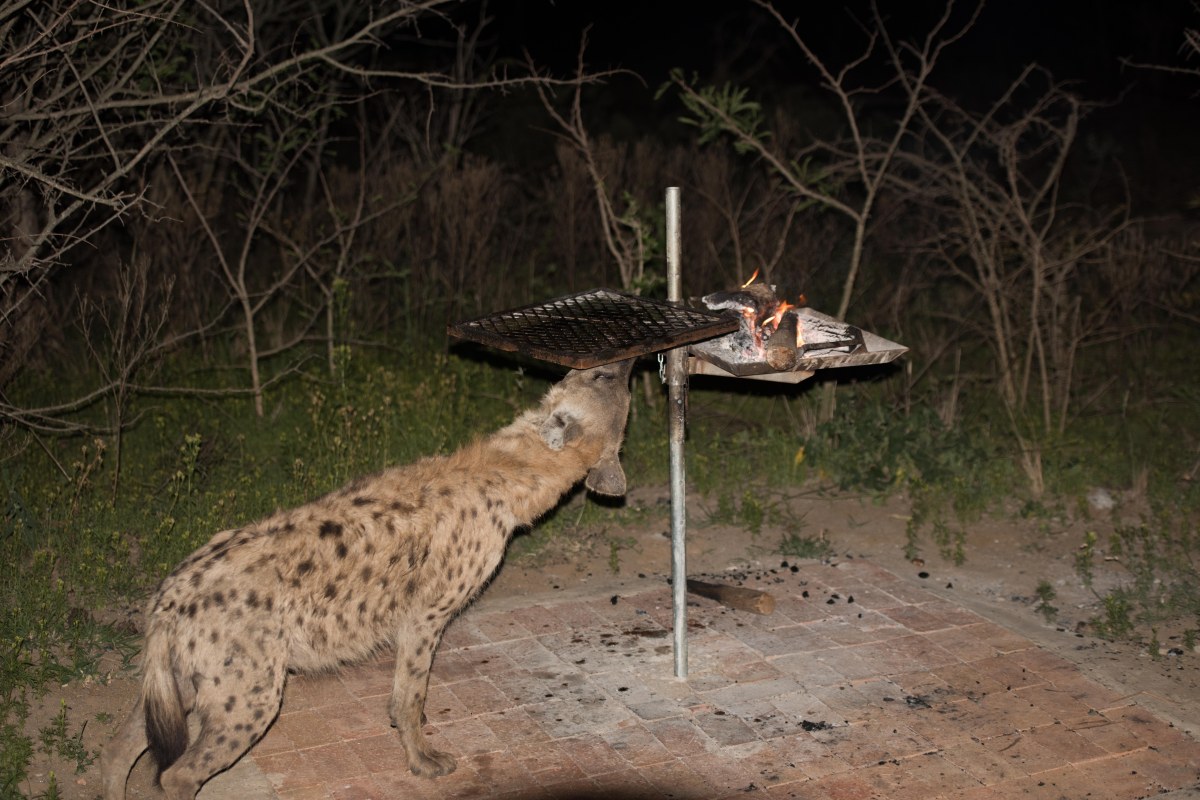 I honestly thought that we really had had enough excitement for one day, so I prepared some food, lit the Braai, worked my way through another beer and quietly pondered if days actually do get any better than this. Obviously, being a South African and and Australian, meat formed a sizeable part of our meal and we polished it off in no time flat. We had decided for a change to eat from our chairs down on the ground, away from the deck and the MSC and I was now feeling very full, fulfilled and pretty happy with things in general. I was half way through some, no doubt entertaining yarn when I noticed that Bretts attention was not quite with me and his eyes were darting back and forward. He quietly let me bang on with my story and when I was finished he just quietly mentioned that I was in no way allowed to panic or run but it would be great if I could just take a peek over my left shoulder. I shifted a bit in the chair and slowly turned around to be looking directly into the bottomless black pits that are the eyes of a Spotted Hyena. My first thought was that these hyenas are obviously attracted to the smells of the cooking in the campsite and are probably ( ??? ) well used to humans. Luckily that thought process was about right. It still does not however, totally prepare you for unexpectedly finding yourself face to face with an apex African predator, especially when you consider the events of the preceding couple of hours. Our solution was to simply quietly get up, check that the MSC was still happily under the kitchen and head back to the deck for a last bevy and to let the hyena do what he had obviously come to do, and that is sample the Braii. I do not know what Hyenas tongues are made of but it must be tough as leather as the grill on the Braai was still blazing hot. It certainly didn’t seem to bother this fellow as he spent a few minutes licking off the fat and any little meaty bits left.